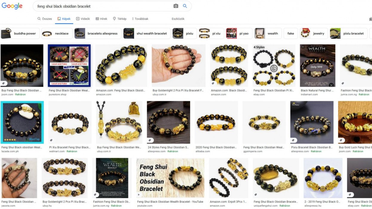 Tovább böngészve az interneten, feng shui fekete obszidián elnevezésű szerencse-karkötőket találtunk 3-4 ezer forintért is, de van aki mindösszesen 200 forintért árulja a kínai bizsukat. Ez nem is meglepő, hiszen a magyar oldalakon megtalálható karkötőket, azok kísérteties mását kínai oldalakról 1 dollárért bárki megrendelheti magának. Sőt, olyan ázsiai hirdetőt is találtunk, aki mindössze 10 centért, azaz mindössze 32 (!) forintért árul egy ilyen karkötőt. Igaz, ott a csecsebecsék körül nincsenek átverős videós hirdetések.